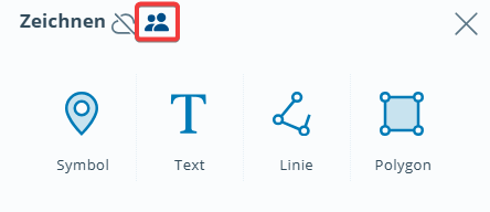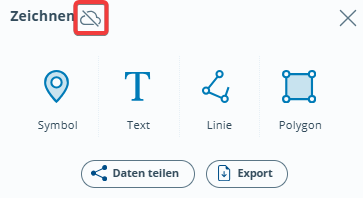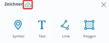 Der Button Zeichnen befindet sich unten rechts in der Werkzeugleiste. Durch Anwählen des Werkzeugs erscheint ein Fenster, das die Möglichkeit bietet, ein Symbol, eine Linie oder ein Polygon zu zeichnen oder einen Text zu setzen.