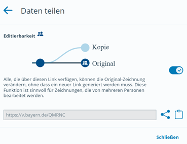 Wenn Sie eine Zeichnung erstellt haben, können Sie die Zeichnung als Kurz-URL teilen. Dabei können Sie entscheiden, ob der Empfänger durch seine Bearbeitung die Original-Zeichnung so verändern kann, dass die Bearbeitung in Ihrer Zeichnung sichtbar wird (gemeinsame Bearbeitung einer Zeichnung) oder die Original-Zeichnung unverändert bleibt.
